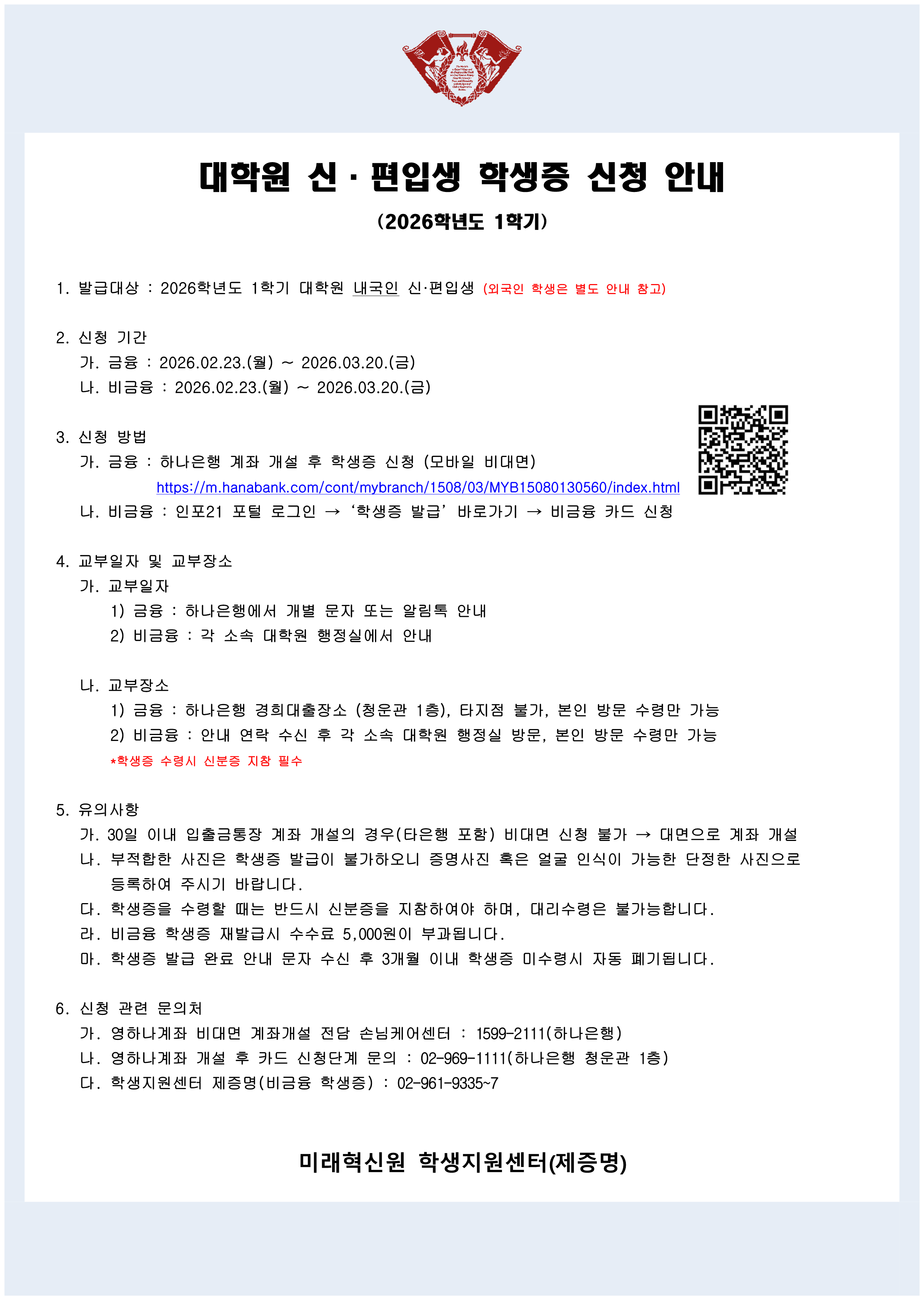 2026학년도 1학기 대학원 신·편입생 학생증 신청 안내