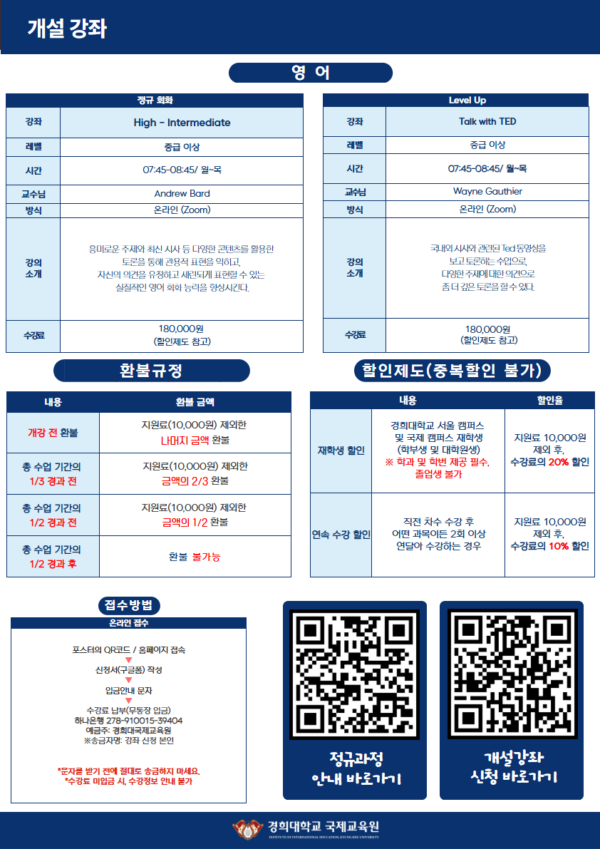 ※ 인원수 미달로 폐강된 강좌는 추가 등록을 받지 않습니다.