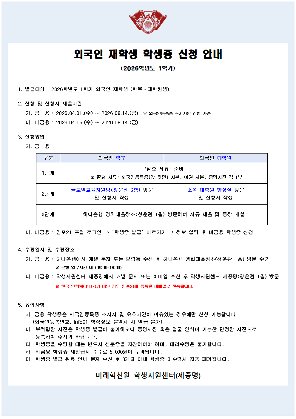 2026학년도 1학기 외국인 재학생 학생증 신청 안내