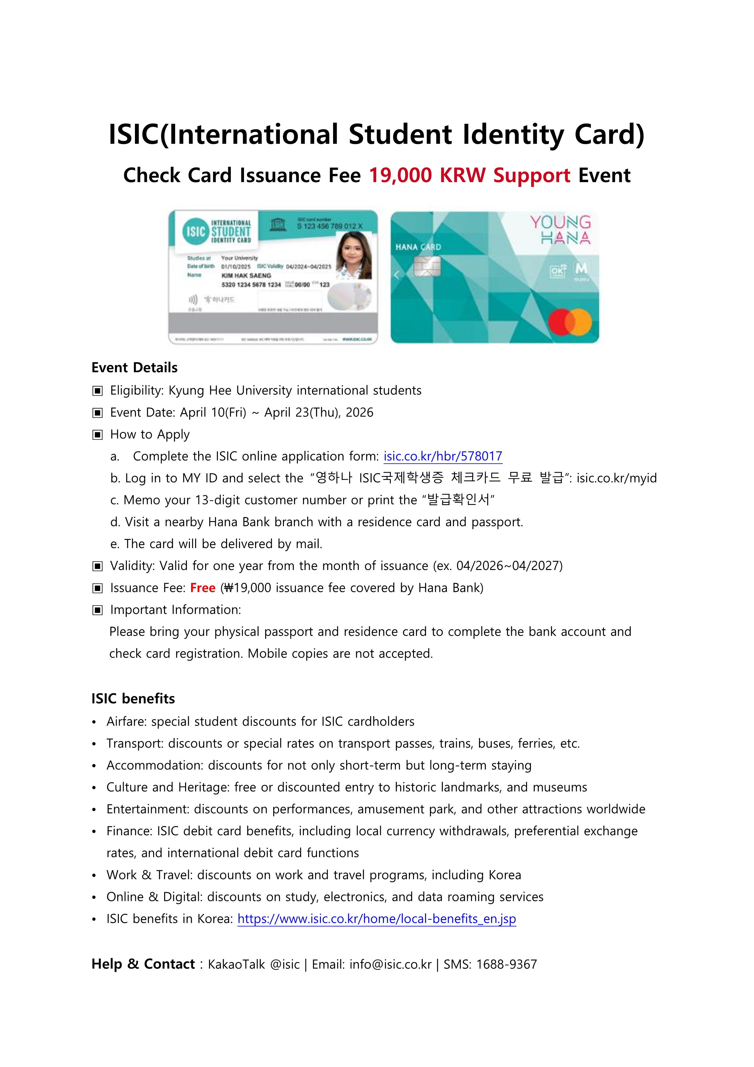 [학생지원센터(제증명)] 2026학년 1학기 국제학생증 ISIC 발급비 지원행사