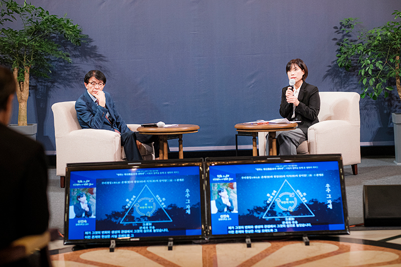 전승화의 관점에서 바라보면, 인간이 살아가는 세계는 지구 행성이라는 무한한 생명 시스템과 연결된 시스템이다. 따라서 지구공동사회의 일원은 인간만이 아니라 볼 수 있다. 신 교수는 “설립자가 상상했던 평화의 길이 ‘마땅히 존재해야만 하는(ought to be, ought to do)’ ‘오토피아(Oughtopia)’의 세상이었으며, 그것은 유토피아(Utopia)나 디스토피아(Dystopia)가 아닌 제3의 길에 대한 설립자의 상상이자 소망의 표현이었다”라며 발제를 마쳤다.
