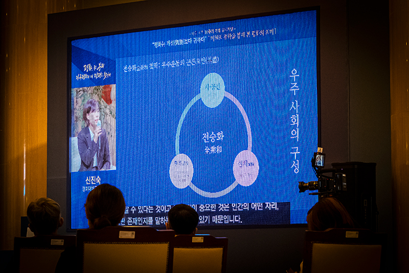 설립자의 역사관은 변신적 변화의 역사관, ‘메타모포시스(Metamorphosis)’ 역사 철학이었다. 그는 평화의 개념이 단순하게 고정된 이상의 실현이 아니라 끊임없이 변화하는 역사적 계기 속에서 인류사회의 의식혁명을 만들어내는 주요 개념이라 설명했다. 신 교수는 나아가 물질과 정신을 분리하지 않는 전승화 철학 속에서 구성되는 ‘지구공동사회(Global Common Society)’에 대한 설립자의 문명사회 이론을 소개하고, 이를 바탕으로 평화가 인류의 당위적 요청일 수밖에 없는 이유를 논했다. 신 교수는 전승화의 관점에서 지구공동사회의 본질적 시각은 인간과 문화뿐 아니라 자연 그 자체, 인간이 아닌 모든 존재가 얽혀 살아가는 사회를 지향하는 것이라는 점을 재차 강조했다.