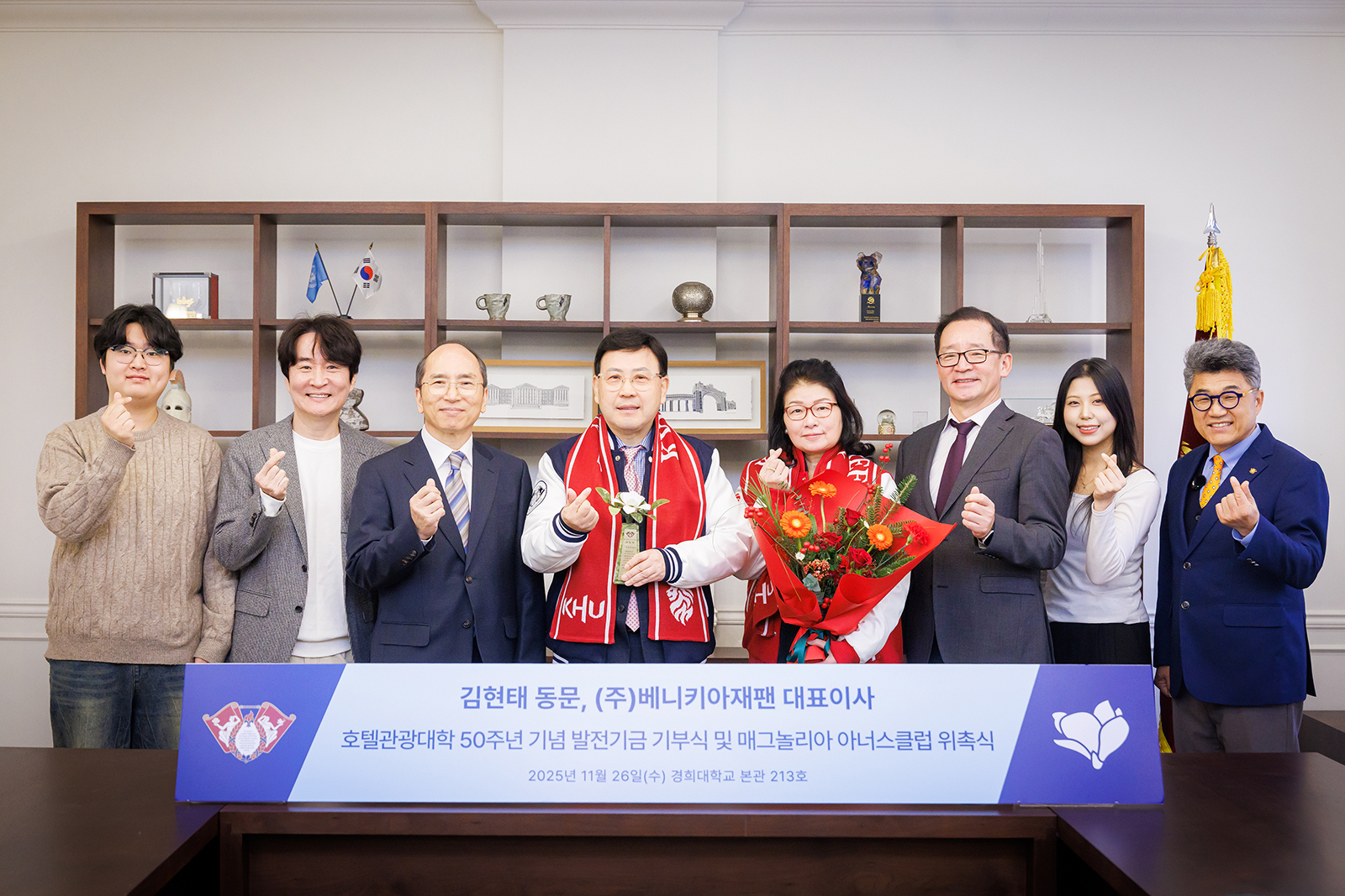 김 총장은 “김 동문은 일본에서 쓰러져가는 호텔을 인수해 2년 만에 흑자로 전환했다. 창조적 노력과 도전을 대하는 그 모습은 경희에서의 시간이 반영된 결과일 것이다. 김 동문의 성공 이면에는 경희를 사랑하는 마음이 있다”라며 기부자의 개척 정신과 모교 사랑에 감사 인사를 전했다. 이어 “호텔관광대학이 세계 최고의 성과를 도출할 수 있도록 노력하겠다. 이번 기부가 경희의 발전에 큰 응원이 됐다”라고 밝혔다.