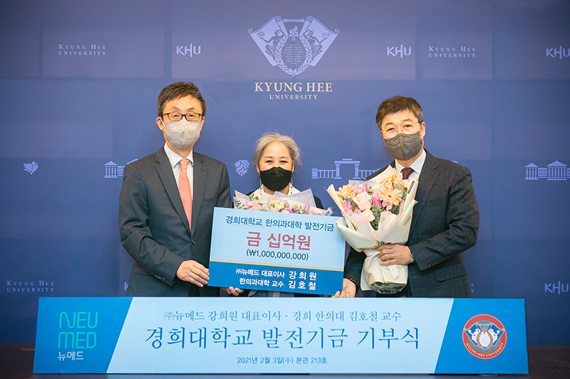 강희원 ㈜뉴메드 대표는 “모체 격인 경희대에 발전기금을 기부하게 돼 매우 기쁘다. ㈜뉴메드의 발전에 도움을 준 경희대에 보답하는 의미로 기부를 결정했다”라며 “기부금이 한의과대학의 본초표본박물관 설립과 운영에 사용되길 바란다”라며 기부의 의미를 설명했다. 이어 “㈜뉴메드는 경희대 이공계 대학 평가 자연과학계열의 산학협동 및 기술실용화 부문에서 높은 평가를 받아왔다. 앞으로도 경희대와 천연물 소재 연구 분야에서 더욱 활발히 협력할 계획이다”라고 말했다.