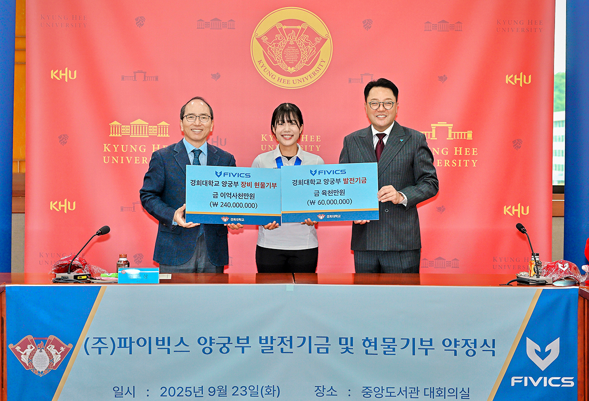 9월 23일(화) 국제캠퍼스 중앙도서관 대회의실에서 ㈜파이빅스(대표 백종대)와 양궁부 발전기금 및 현물기부 약정식이 진행됐다. 파이빅스는 양궁 장비 제조기업으로 지난 2024 파리올림픽에서 공식 표적지 납품 기업으로 지정되기도 했다. 약정식에는 김진상 총장, 김종복 대외부총장, 김도균 대외협력처장, 오경록 체육대학장 및 체육부장, 최희라 양궁부 감독 및 선수단과 파이빅스 백종대 대표, 경기도양궁협회 임종수 부회장, 수원시 양궁협회 봉주현 부회장이 참석했다.