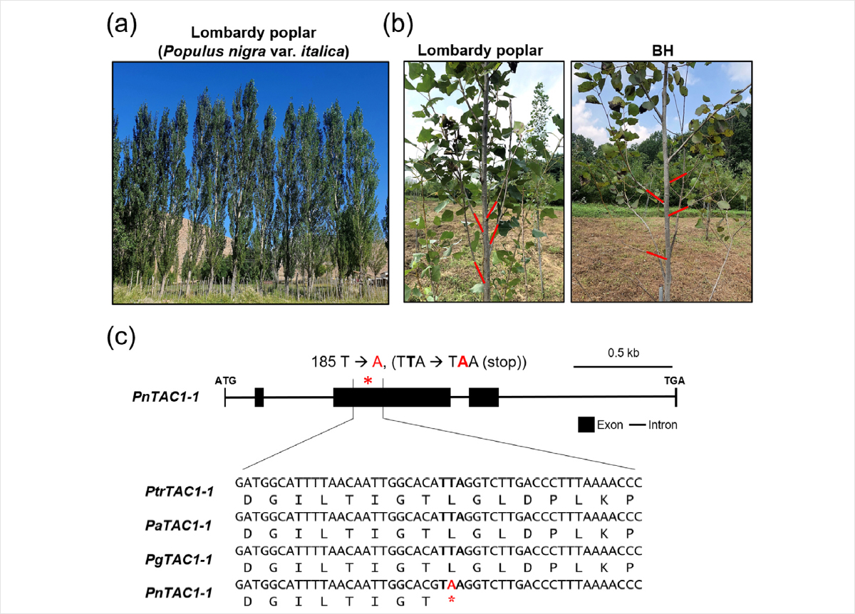 그린바이오과학원 고재흥 교수 연구팀이 포플러의 가지 각도와 수관 구조를 결정하는 핵심 유전자 기능을 최초로 규명하고, 유전자 편집 기술로 직립형 수관을 구현했다. 그림 설명. 롬바르디 포플러의 수직형 수관이 TAC1 유전자의 단일 염기 돌연변이에 의해 형성됨을 보여준다.