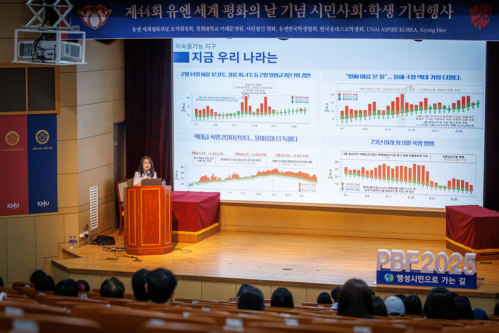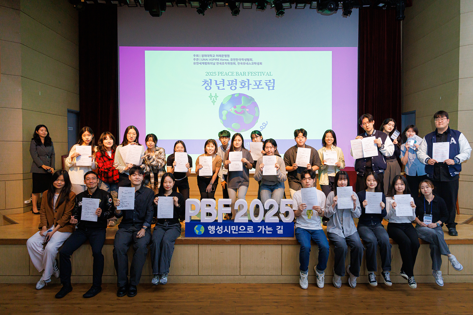 기후 위기는 불평등하다. 선진국과 기성세대가 기후 위기의 원인을 제공했는데, 변화된 기후의 피해는 개발도상국과 미래세대를 향한다. 9월 20일(토) 오비스홀에서 기후 위기의 불평등에 관한 미래세대와 시민사회의 목소리를 듣는 행사가 열렸다. Peace BAR Festival 2025의 연관 행사로 진행된 ‘시민사회·학생 기념행사’, ‘콜로키엄’, ‘청년 평화 포럼’ 등이었다. 세계평화의 날을 기념하며 해마다 다양한 활동을 펼쳐온 기관들이 PBF 2025를 통해 경희와 함께 행사를 개최했다. 세계평화의 날을 공통의 주제로 기관과 시민사회 연대의 장이 열린 것이다.