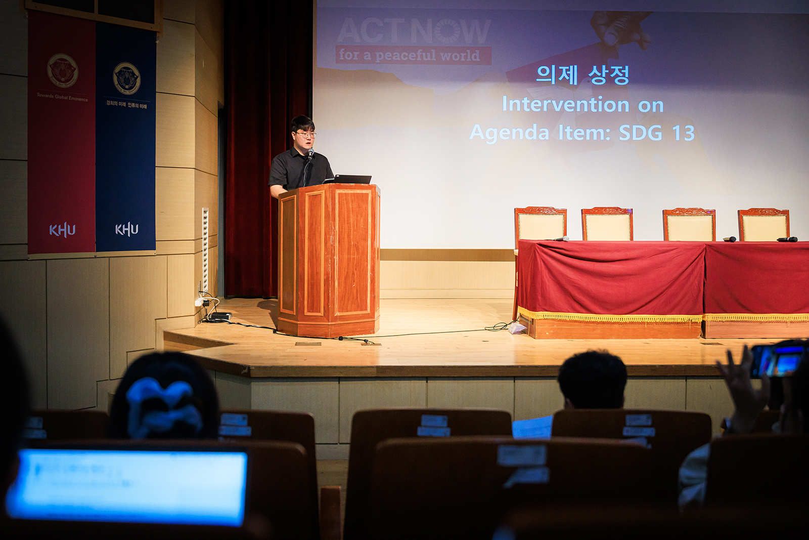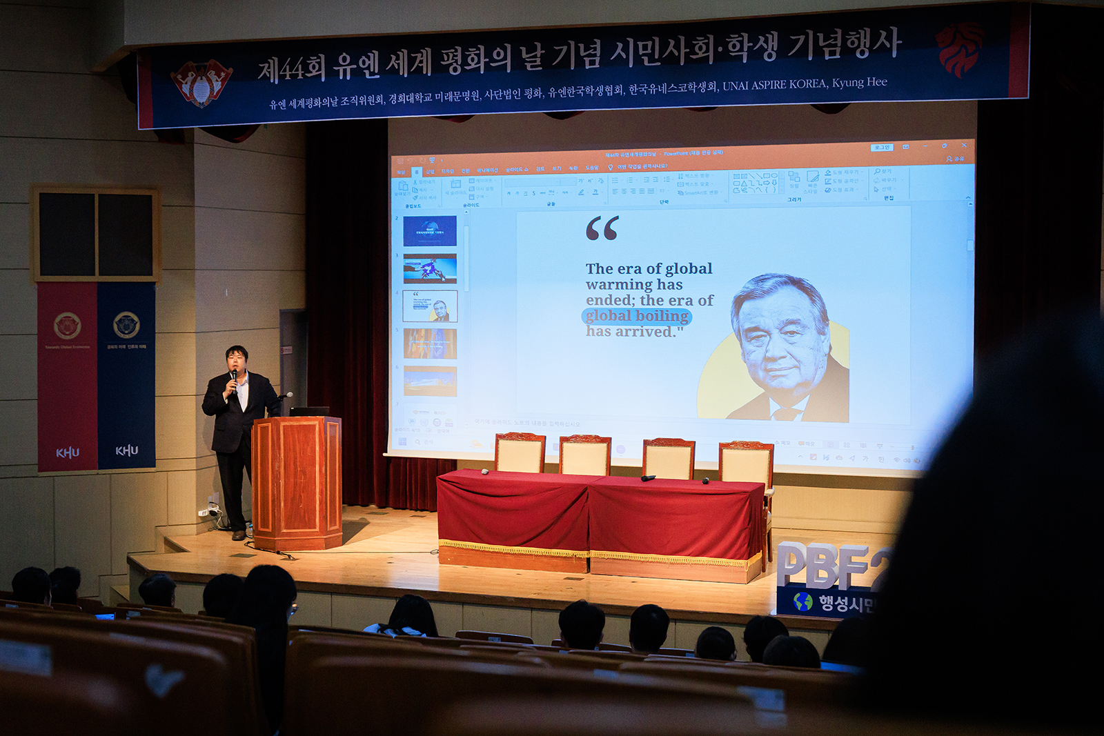 유엔 세계평화의 날 한국조직위원회 김성곤 이사장은 인사말에서 세계평화의 날이 제정된 과정을 소개했다. 그는 “유엔 세계평화의 날은 경희학원 설립자 미원(美源) 조영식 박사가 제안한 날이다. 1년에 하루라도 총성이 없는 날, 우리가 하루라도 인류의 평화를 함께 기원하는 날을 만들자는 그의 제안을 유엔이 따랐다. 한국인으로서 자부심을 가질만한 뜻깊은 날이다”라고 설명했다. 이어 유엔이 올해 세계평화의 날을 기념하며 발표한 메시지 “평화로운 세상을 위해 지금 행동하라(Act Now for a Peaceful World)”를 공유하며 기후 위기의 시급성을 강조했다.