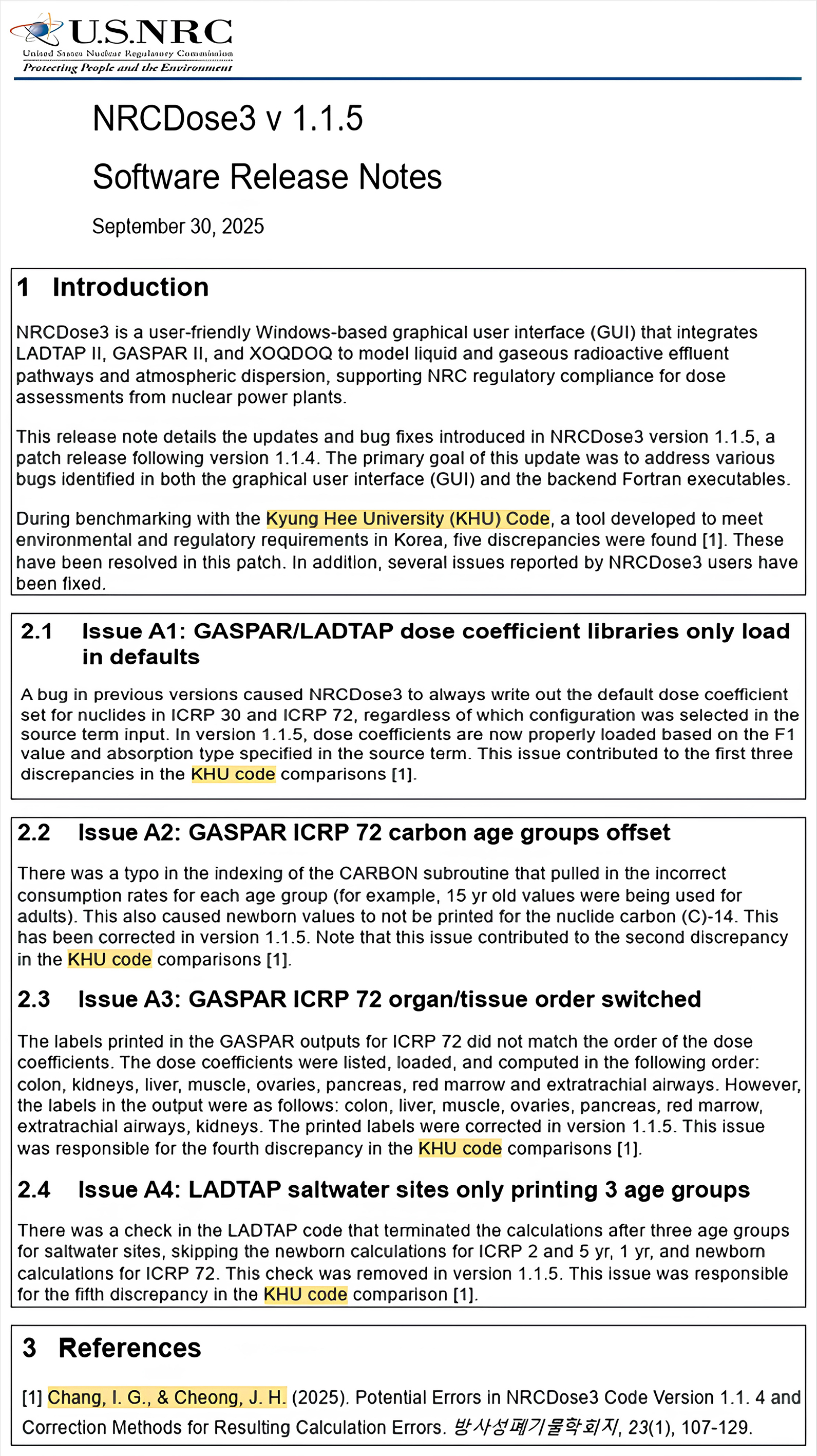 해당 연구 결과는 지난 3월 학술지『Journal of Nuclear Fuel Cycle and Waste Technology』에 게재됐고, 9월 NRC가 공개한 보고서에서 NRCDose3 코드 불일치 수정의 근거로 공식 인용됐다. 보고서에는 논문에서 제기한 불일치 5건이 실제로 수정·반영됐으며, 본문에 경희대의 연구 결과임이 명시적으로 언급됐다. 이를 통해 연구진이 원전 인허가·안전성 평가에 활용되는 핵심 코드의 신뢰성과 정확성 개선에 기여했음을 공식적으로 인정받았다.