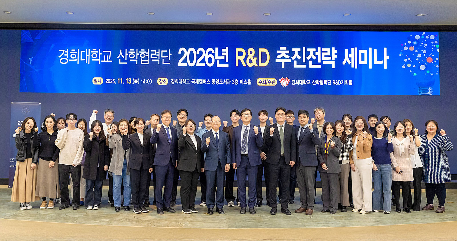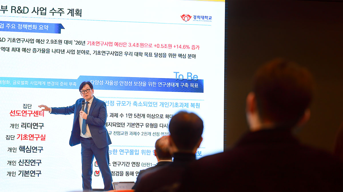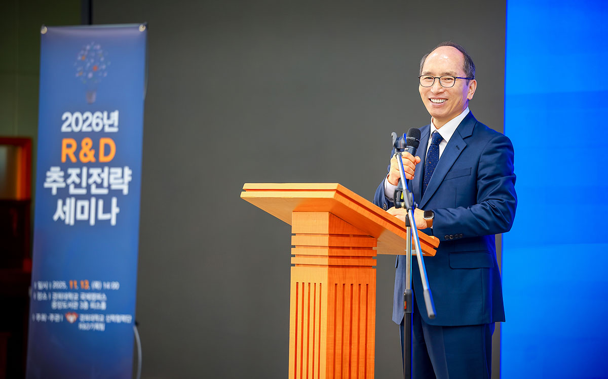 11월 13일(목) 국제캠퍼스 중앙도서관 피스홀에서 ‘2026년 R&D 추진 전략 세미나’가 개최됐다. 2026년 정부의 R&D 정책 변화에 대응하고, 나아갈 길을 제시하기 위함이다. 홍인기 산학협력단장은 “2026년을 대비해 미리 정부 정책을 살피고, 목표를 설정하기 위해 이번 행사를 기획했다. 산학협력단이 추구하는 높은 이상을 달성하기 위해 모두가 함께 고민하고, 지혜를 모아야 한다”며 행사 취지를 설명했다.